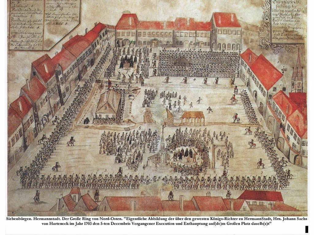 Decapitarea lui Johannes Sachs von Harteneck, primar al Sibiului si comitele sasilor, gravura din 1703, Piata Mare, in care se vede si Stalpul infamiei cu statuia lui Roland. Sursa Foto: patrimoniu.sibiu.ro