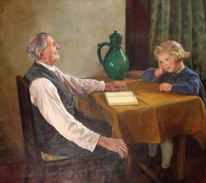 La ceasul poveștilor, când lectura trece spre amintiri. Bunicul si nepoata/Großvater und Enkelkind, tablou de Eduard Morres